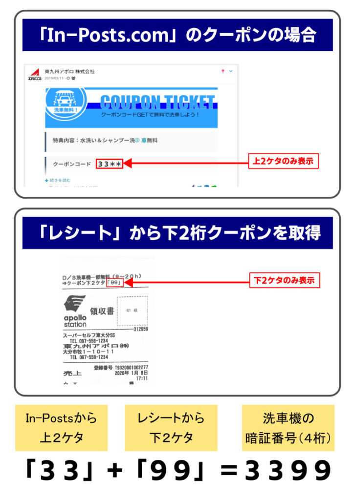 - 「In-Posts.com」から利用する店舗の「洗車クーポン」の上2ケタを取得してください。